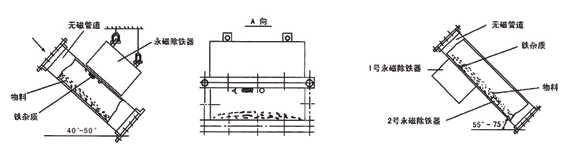RCYA1、RCYA2系列管道永磁除鐵器包括無磁管道和永磁鐵兩部分,專用于封閉管道內非磁性物料的除鐵,永磁除鐵器內部采用高性能稀土強磁材料組成復合磁系。具有體積小、磁力大、重量輕、除鐵干凈、方便、無能耗、使用壽命長等特點。適合沒有輸送皮帶,只能提供下料溜槽的場合。當散狀物料經過時,鐵雜物被高場強的永磁鐵吸附,清除鐵雜質時,打開管道專用門將雜質取除。該設備適用于含鐵量較少的場合,主要應用于水泥、化工、煤炭、塑料、耐火材料、建材等行業(yè)的下料管道中清除雜質。
