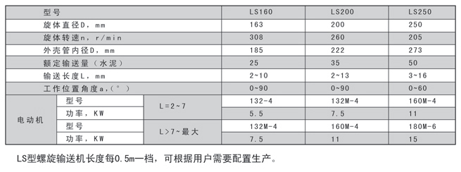 LS型螺旋輸送機(jī)是按照J(rèn)B/T679-95《螺旋輸送機(jī)》標(biāo)準(zhǔn)設(shè)計(jì)制造,是GX型螺旋輸送機(jī)的換代產(chǎn)品。頭部及尾部軸承移至殼體外.吊軸承采用滑動(dòng)軸承,沒(méi)有防塵密封裝置,軸瓦一般采用粉末冶金,輸送水泥采用毛氈軸瓦,吊軸和螺旋軸采用滑塊連接.拆卸螺旋時(shí),不用移動(dòng)驅(qū)動(dòng)裝置,拆卸吊軸承時(shí)不用移動(dòng)螺旋.不拆卸蓋板可以潤(rùn)滑吊軸承,整機(jī)可靠性離,壽命長(zhǎng).適應(yīng)性強(qiáng),安裝維修方便。 主要技術(shù)參數(shù):